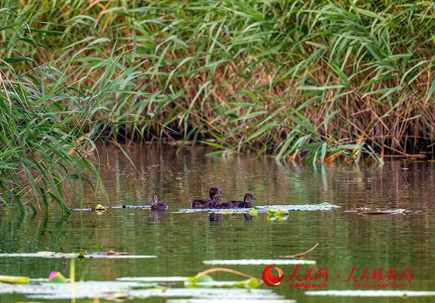 5、近日,來自雄安新區安新縣的愛鳥護鳥志愿者、生態攝影師張學農在白洋淀某處水域發現了約30只國家一級保護野生動物青頭潛鴨的身影,并且拍到了青頭潛鴨雌鳥與雛鳥活動的影像。
