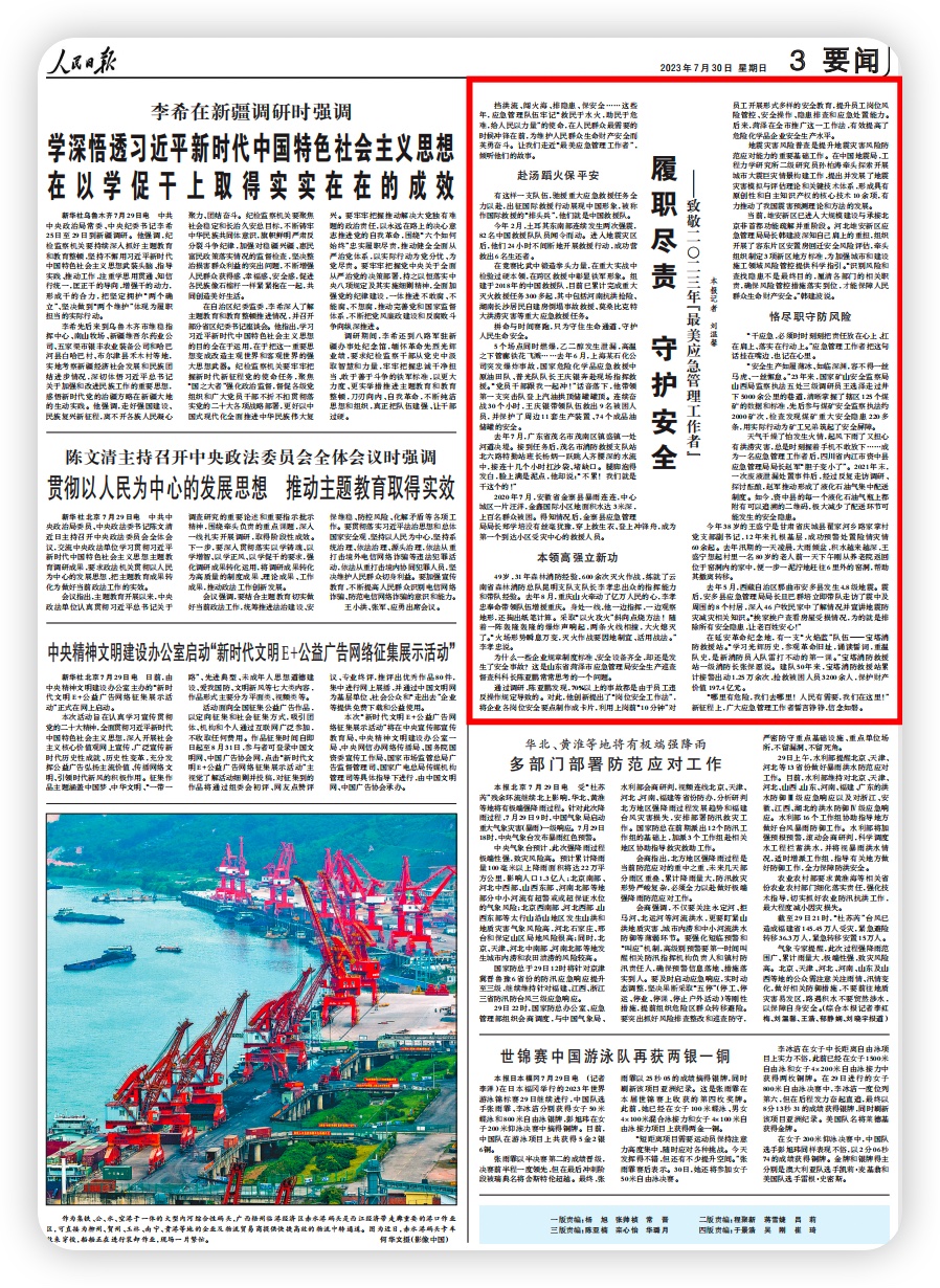 “安全生產如履薄冰、如臨深淵,容不得一絲馬虎、一絲懈怠?!?3年來,國家礦山安全監察局山西局監察執法五處三級調研員王選澤走過井下5000余公里的巷道,清晰掌握了轄區125個煤礦的數據和標準,先后參與煤礦安全監察執法約2000礦次,檢查發現煤礦重大安全隱患220多條,用實際行動為礦工兄弟筑起了安全屏障。