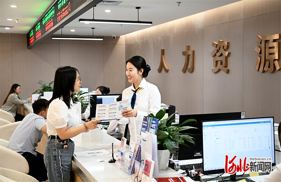 7月19日,雄安人力資源服務產業園工作人員(右)向辦事群眾介紹“雄才卡”的辦理手續。 河北日報記者 張 昊攝