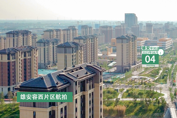 今天是2023年8月4日,星期五,天氣雷陣雨,26℃~33℃。在封面和大家見面的是雄安容西片區航拍。