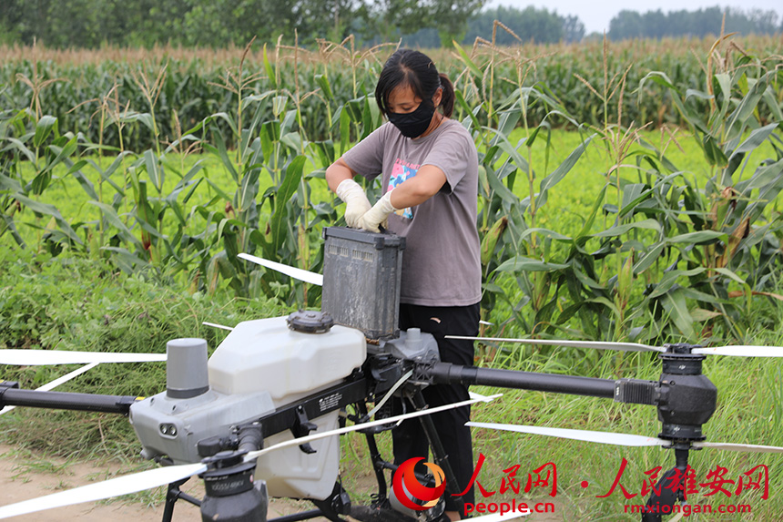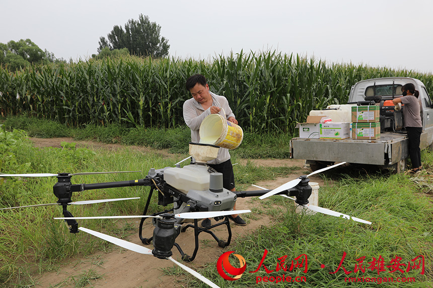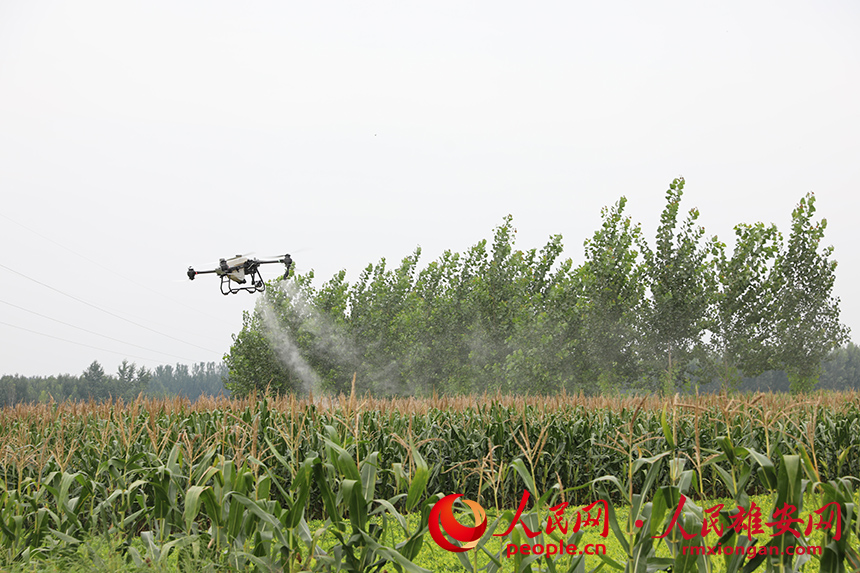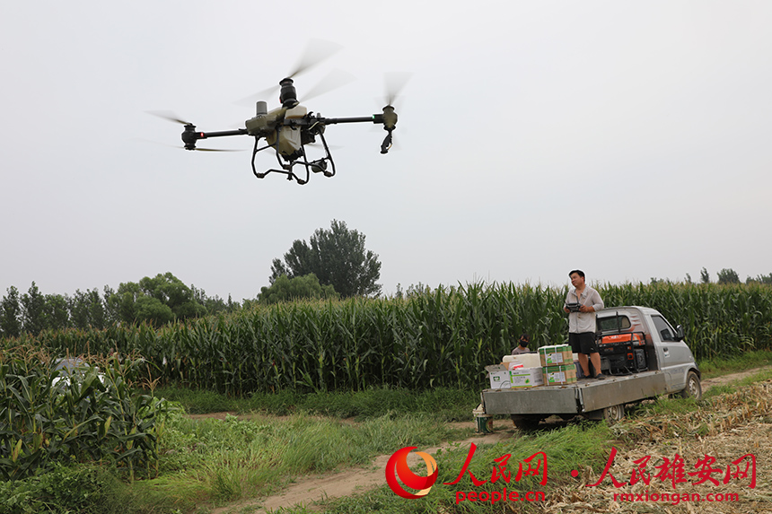 工作人員操作無人機對涿州市百尺竿鎮泗各莊村田間玉米進行農藥噴灑。人民網記者 王紅攝
