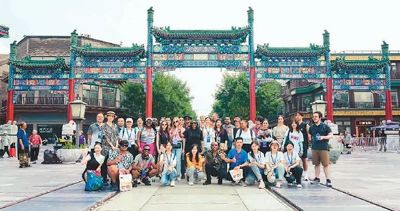 圖為8月9日,暑期班學員參觀中軸線時,在前門大街合影。北京第二外國語學院供圖
