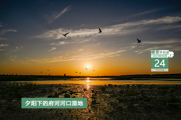 今天是2023年9月24日,星期日,天氣多云,14℃~22℃。在封面和大家見面的是夕陽下的雄安府河河口濕地。