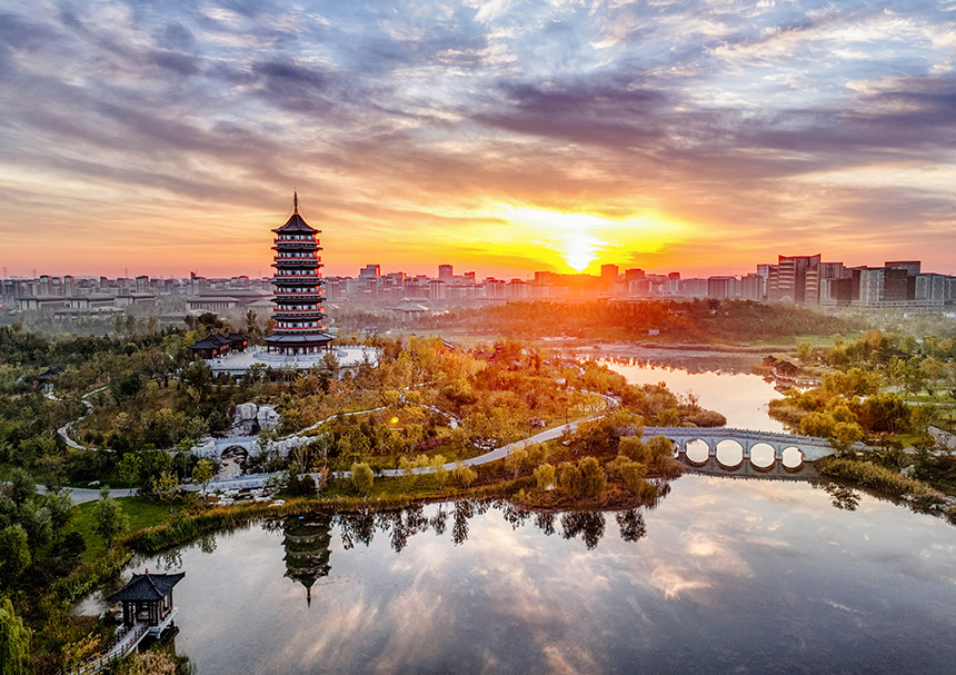秋天的雄安悅容公園,晨光灑在湖面,倒映著古香古色的安和塔,賞心悅目。胡忠攝
