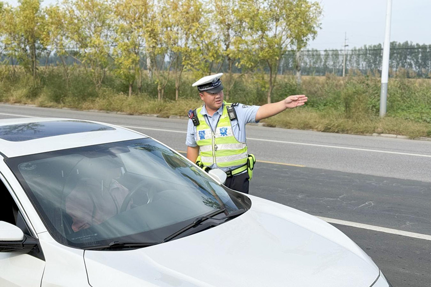 安新縣公安局交通管理大隊民警在白洋淀景區停車場路段巡邏時為外地牌照車輛指路。李若迪攝